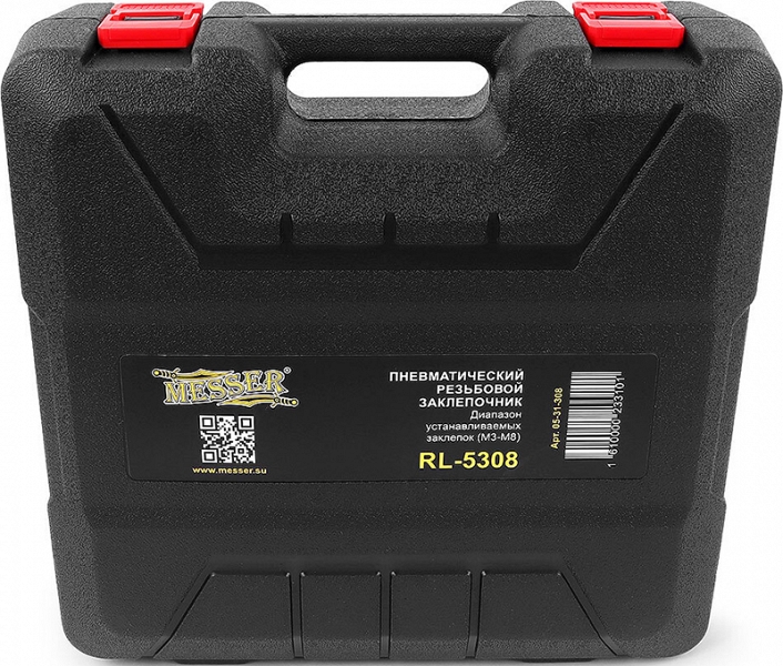 Пневматический резьбовой заклепочник Messer RL-5308 (Мессер РЛ-5308) – надежный профессиональный пневмозаклепочник (пневмо заклепочный пистолет) для установки алюминиевых, медных, стальных, нержавеющих стальных резьбовых заклепок типоразмером М3, М4, М5, М6, М8.