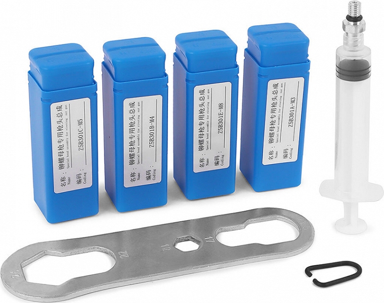 - Установочные комплекты – сменные резьбовые насадки / оправки (наконечники и рабочие стержни) под каждый размер резьбовой заклепки